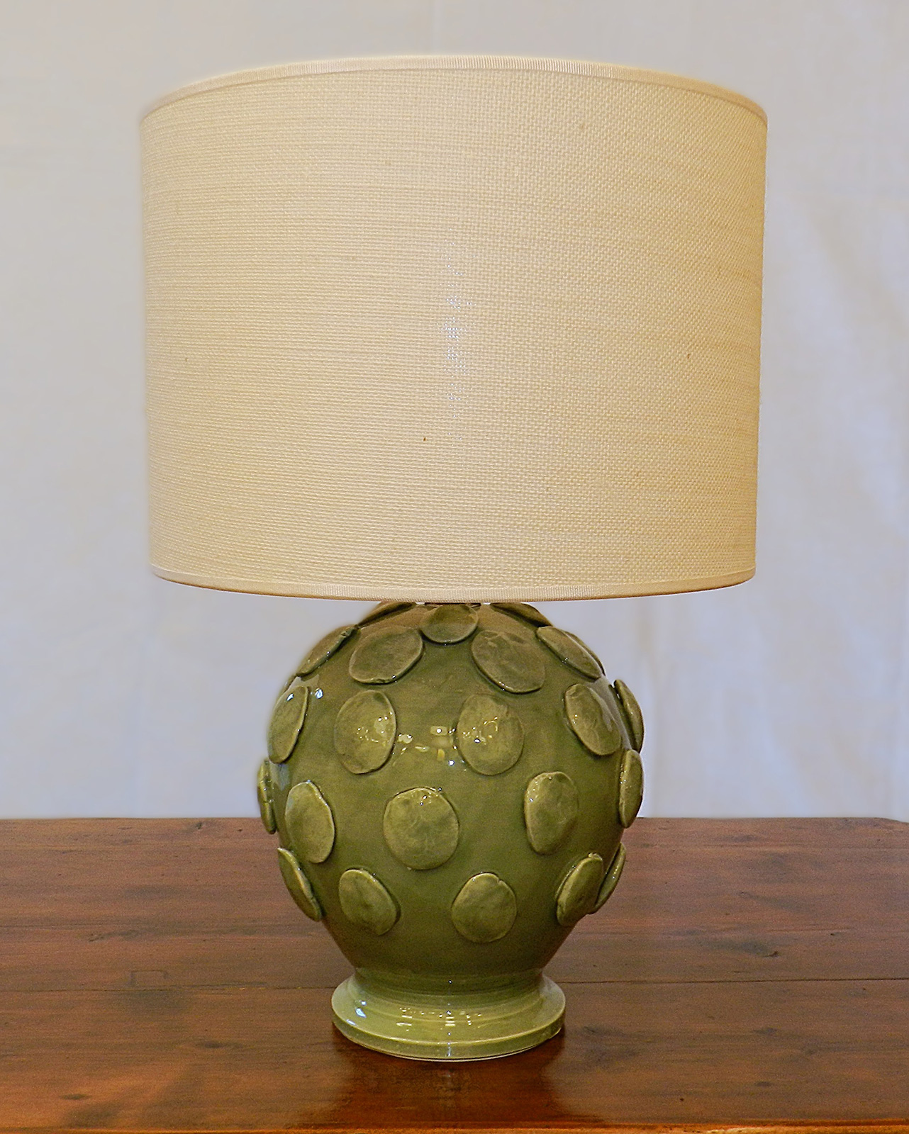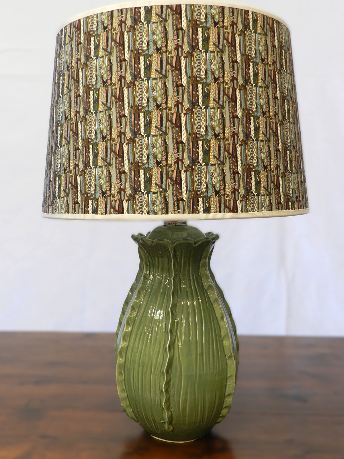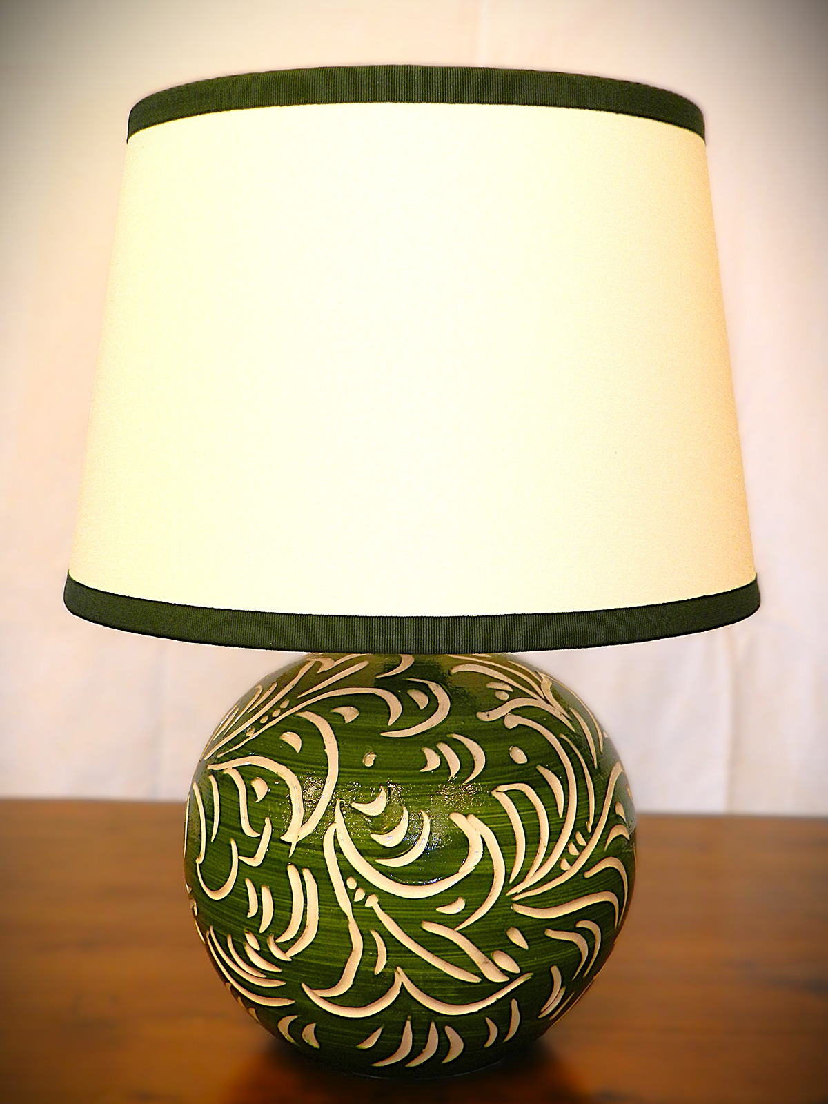 - Lampada in ceramica verde intagliata a mano e paralume in stoffa