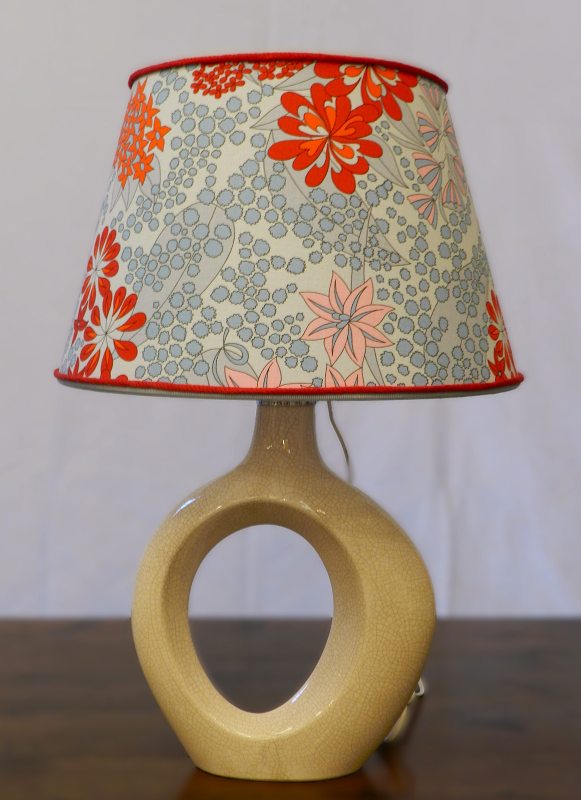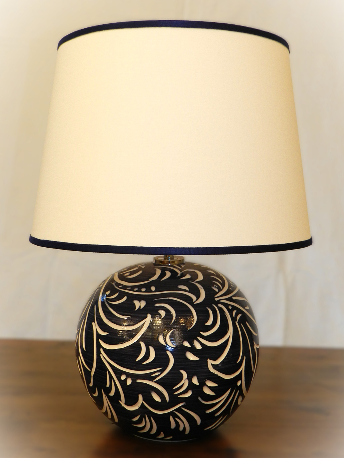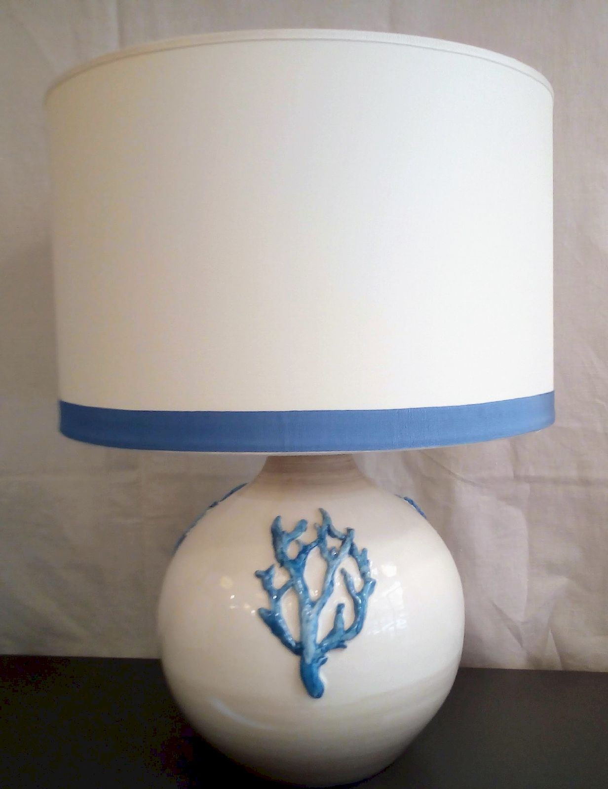 - Lampada da tavolo in ceramica con decoro in rilievo e paralume in tessuto