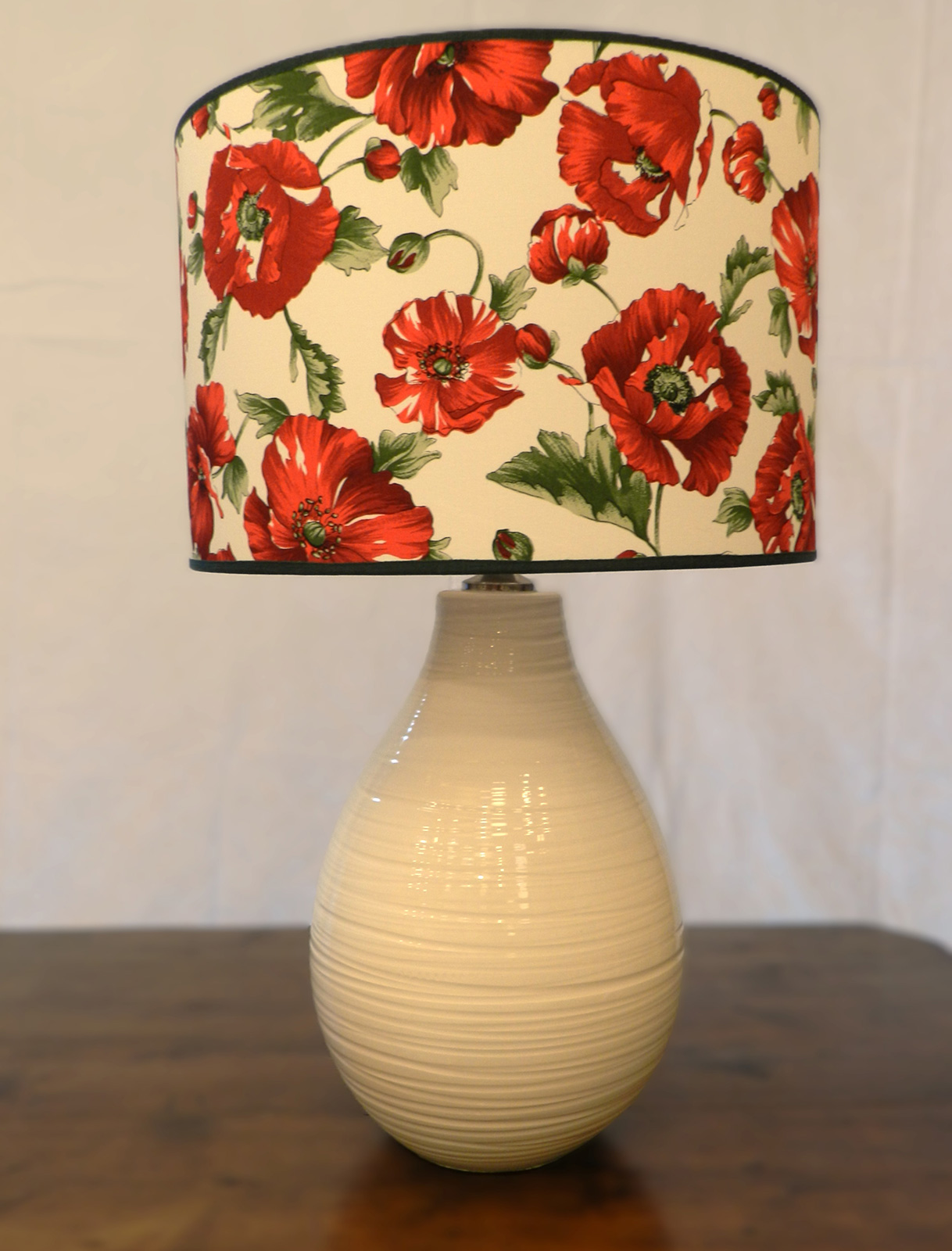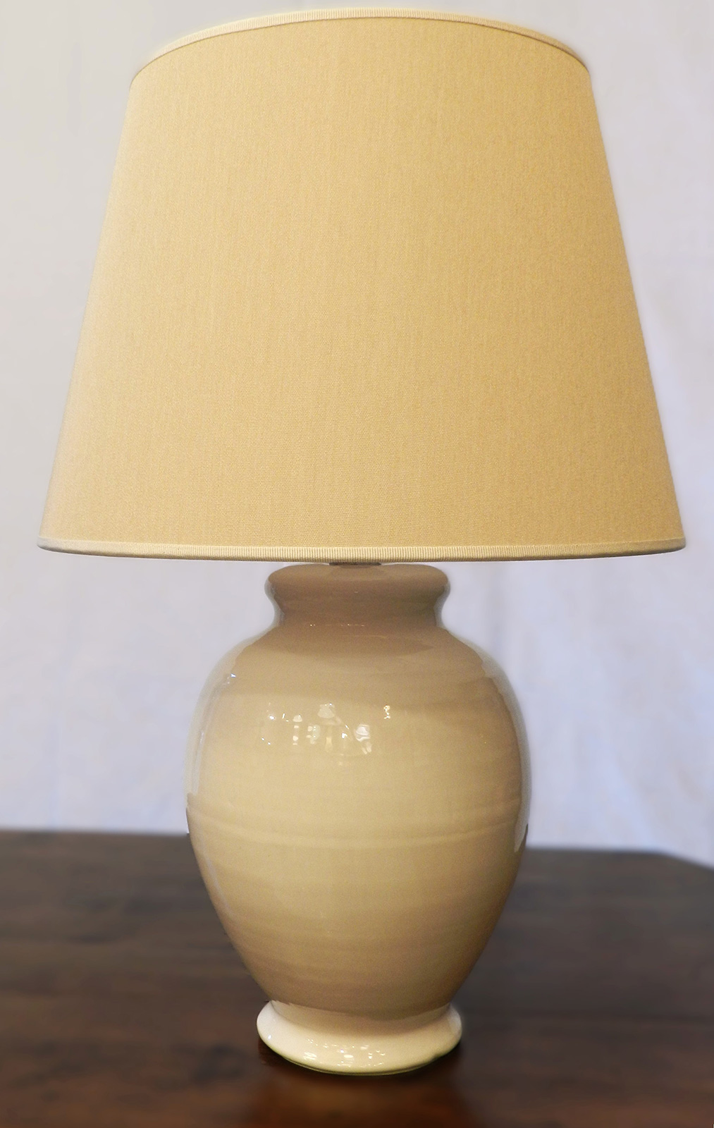 - Lampada da tavolo in ceramica colore burro con paralume in tessuto