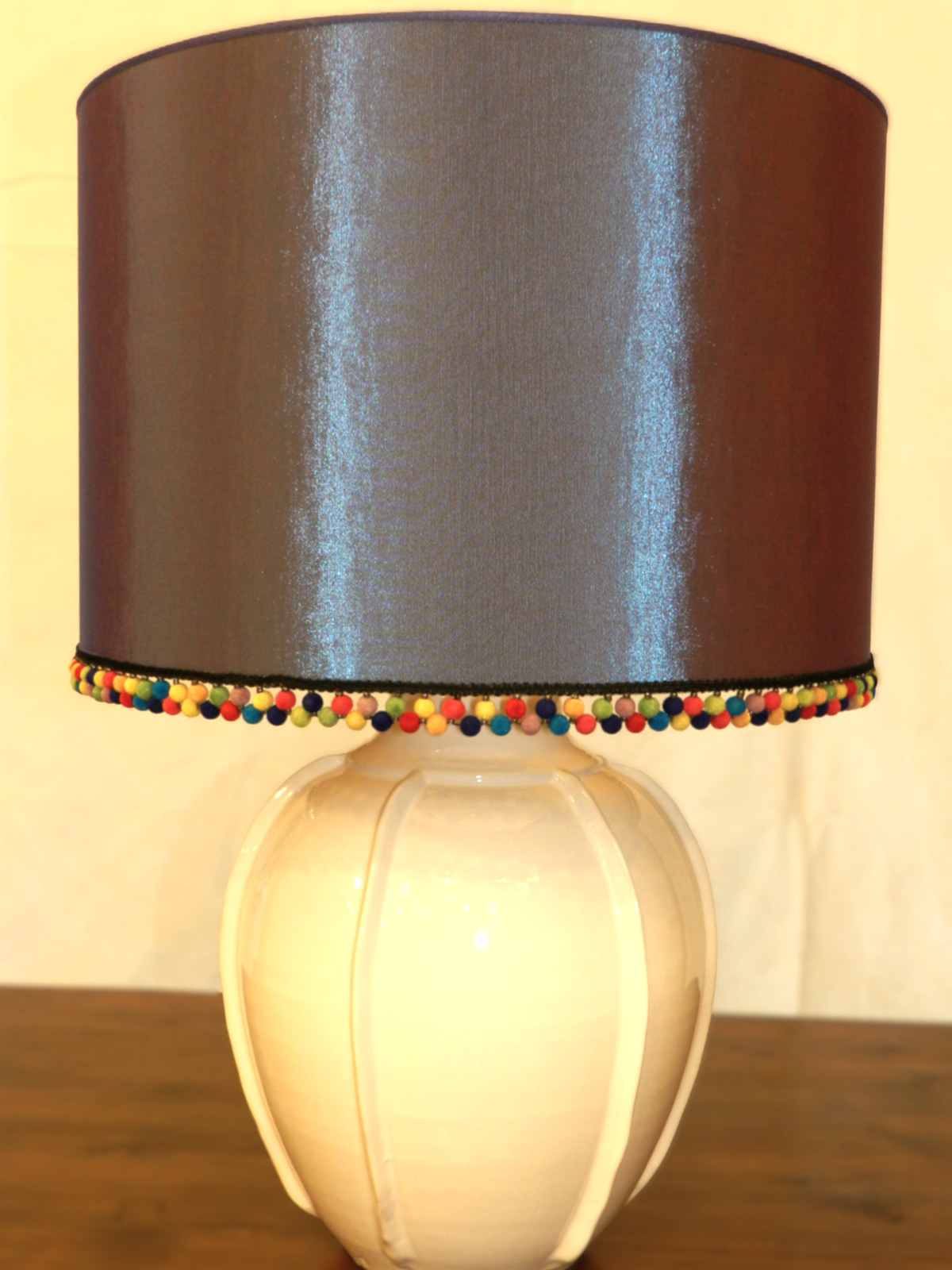 - Lampada da tavolo in ceramica con decoto a rilievo e paralume con pon-pon