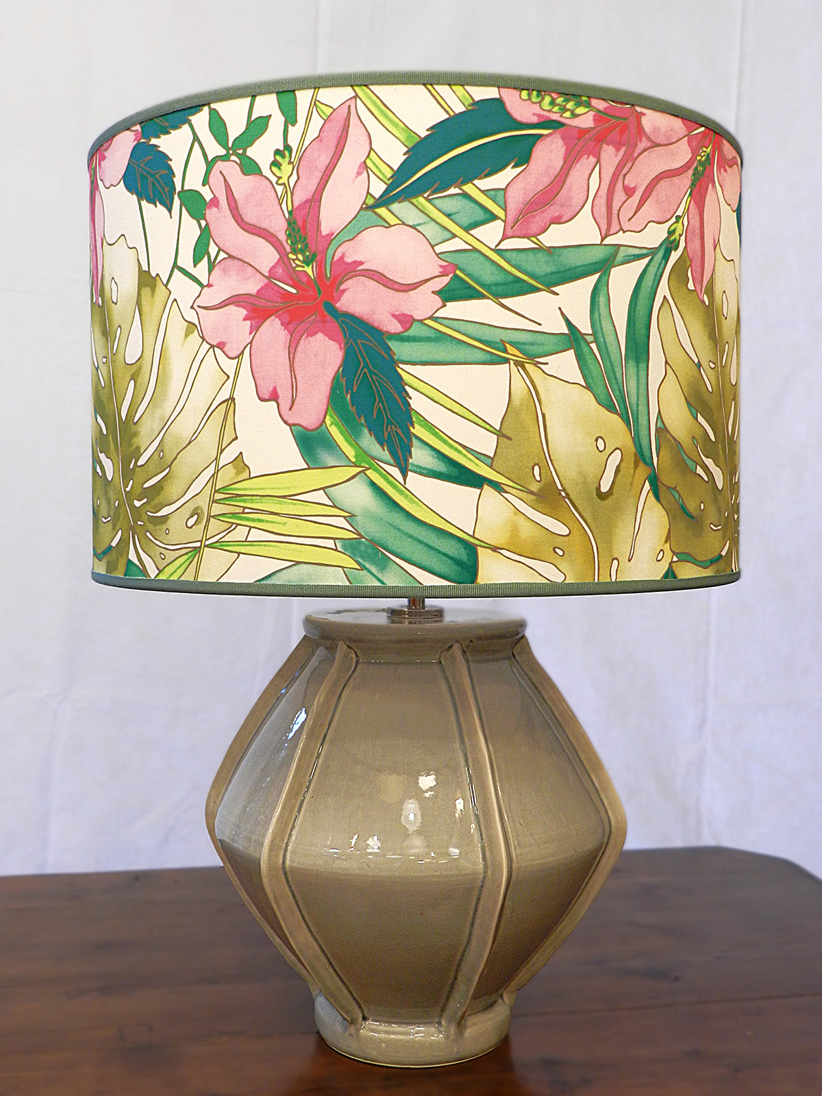 - Lampada da tavolo in ceramica lavorata a mano con paralume in tessuto